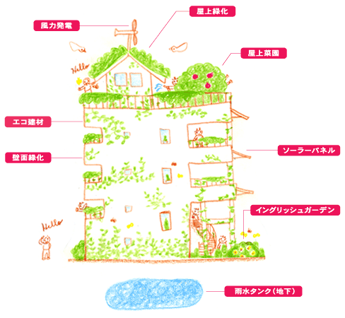 ・屋上緑化、壁面緑化などによる緑の景観づくり、微気候改善や誘鳥植物によるエコアップなど建物の環境共生を実践、演出しています。