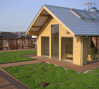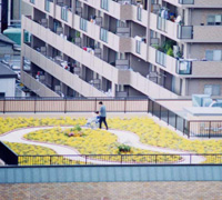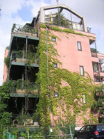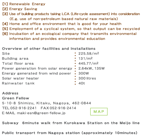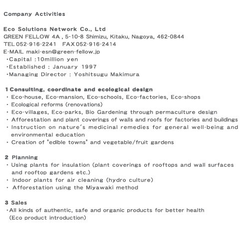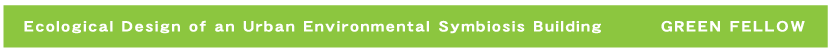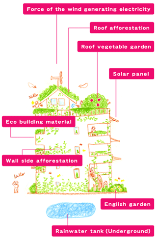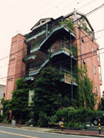 An urban style building, based on ecological design for residence and commercial use was proposed and completed in October 1997. The main feature of this building is its complete symbiosis with the natural environment. For example, the surface of the walls is covered with plants and the upper rooftop has a vegetable garden. Moreover, with the power generation provided by sunlight and wind energy, the collection of rainwater and the vegetable garden, etc, the building is entirely self sufficient in terms of energy, water and even food supply. |